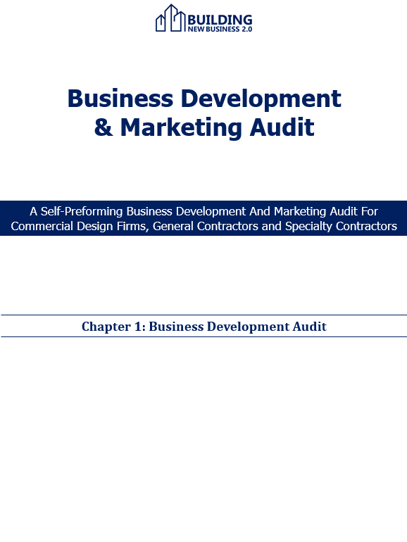 This is step one in our Building New Business 2.0 program. However, many inquiring firms never engage in the program as they are well established in their marketing efforts, have full-time staff for business development and support roles. Still, they find it helpful to challenge their current practices, see how they compare to others in their industry. In the audit, we present 90+ challenges based on over 20 years of working with commercial design firms, general contractors and specialty contractors. The end result identifies areas of opportunity that are typically easy to address.